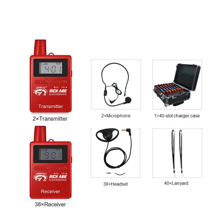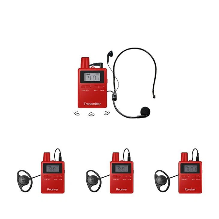 Buwireless tour guide system consists of a transmitter with a headset microphone and a receiver. The speaker wears the transmitter and headset microphone, while the audience uses the receivers. As the speaker talks into the microphone, the audience can hear crystal-clear sound, even from up to 200 meters away.