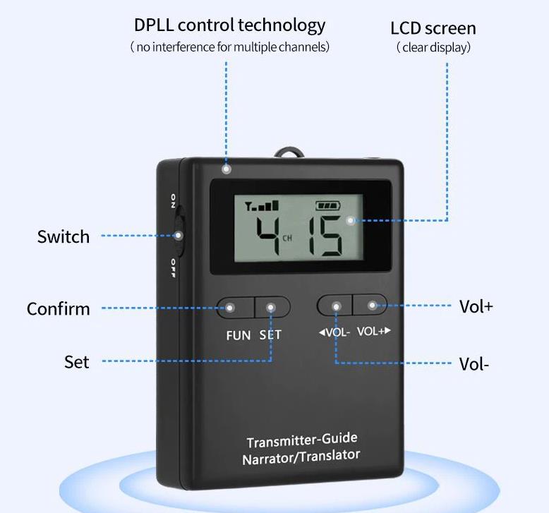Simsiz Tur Təlimat Sistemimiz təhlükəsiz, yüksək sadiqlik səs ötürülməsini təmin etmək üçün ən qabaqcıl UHF simsiz ötürülmə texnologiyasından və ağıllı şifrələmə çiplərindən istifadə edir. Sistem 99 seçə bilən kanala qədər təklif edir və eyni kanalda qoşula bilən cihazların sayına heç bir məhdudiyyət yoxdur, böyük tədbirlər və müxtəlif mühitlər üçün ideal edir.